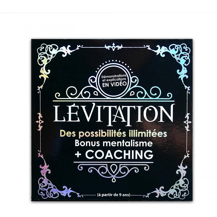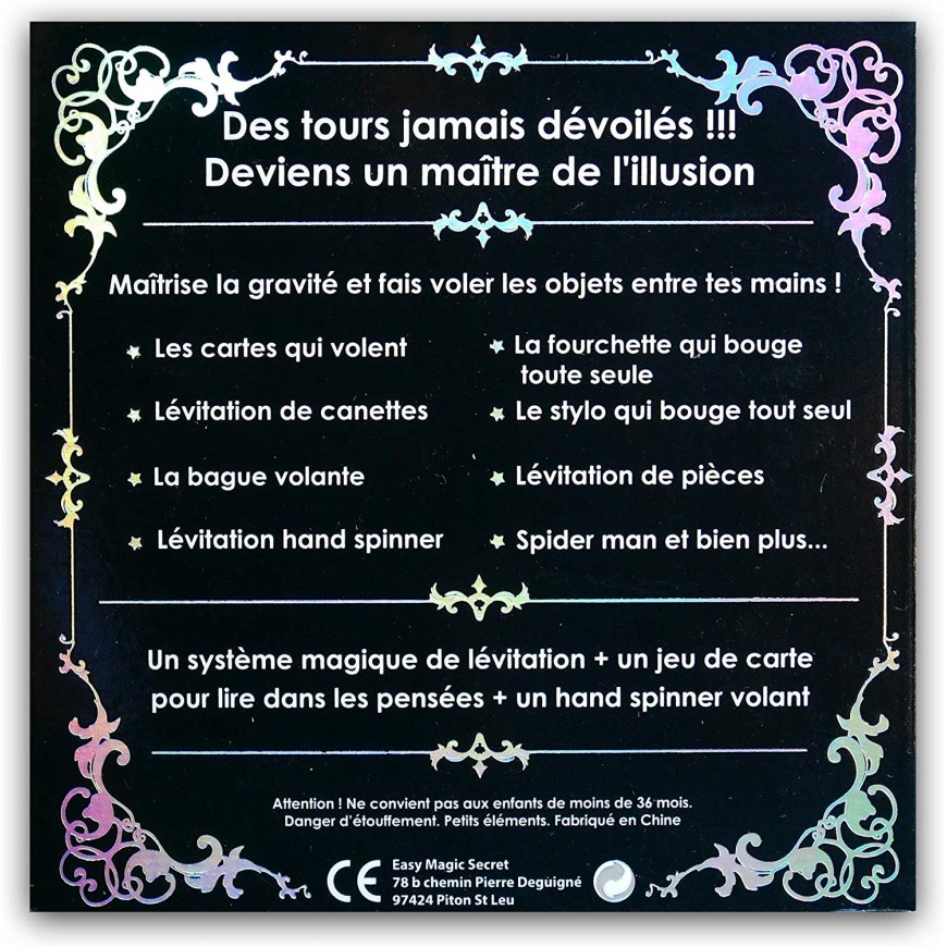 Vous apprendrez à : - Faire voler une bague, des pièces, un billet, des cartes et un hand spinner - Déplacer une fourchette, des lunettes - Mettre une canette de soda en apesanteur - Lire dans les pensées - Et bien plus encore … Tous les accessoires nécessaires et les explications sont fournis avec ce coffret.Lévitation Devenez un Vrai Magicien grâce à ce coffret de magie créé par un magicien professionnel ! Les accessoires fournis et les vidéos disponibles en ligne vous permettront de réaliser des tours de magie professionnels de qualité qui surprendront même les adultes ! Plus de 20 tours expliqués en détail qui laisseront sans voix n’importe quel public. Avec ce coffret de magie sur le thème « lévitation » vous pourrez faire voler « léviter » tous types d’objets légers et même lire dans les pensées des spectateurs. Tous les tours sont expliqués par un magicien professionnel qui a décidé de partager avec vous ses plus grands secrets.