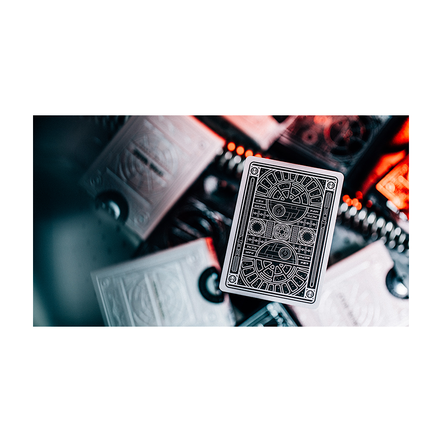 Depuis 1977, Star Wars ™ est un phénomène de la culture pop. Aujourd'hui, Theory11 est fier de présenter une toute nouvelle édition spéciale de Star Wars: Light Side et Dark Side Playing Cards. Canalisez votre Sith intérieur, rejoignez le Premier Ordre ou maintenez l'ordre dans la galaxie aux côtés de l'armée impériale de l'empereur Palpatine. Le pont Dark Side comprend le sabre laser de Dark Vador, l'étoile de la mort et la flotte de vaisseaux spatiaux de l'Empire. «Vous ne connaissez pas le pouvoir du côté obscur!» Sur le devant de la boîte du côté sombre, regardez à travers la fenêtre de la salle du trône impérial, avec les symboles de l'Empire galactique et du Premier Ordre à chaque coin. Les deux jeux contiennent le même jeu de 12 cartes de cour, représentant chaque camp. Du côté obscur, Palpatine est représenté aux côtés de Kylo Ren et Darth Vader - avec un dos gris graphite. Sur le roi de pique, Dark Vador est représenté tenant son sabre laser