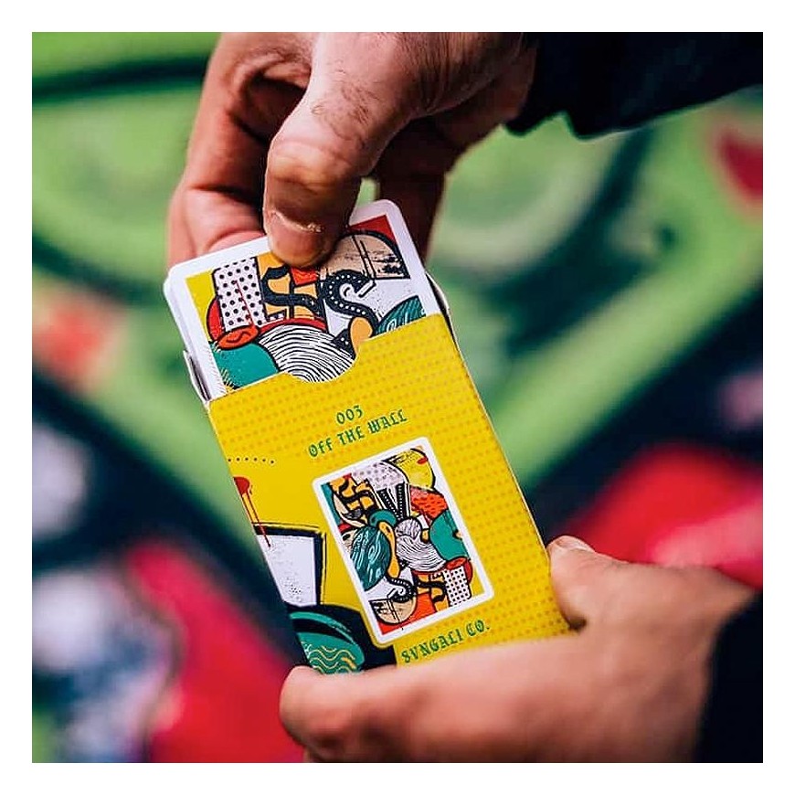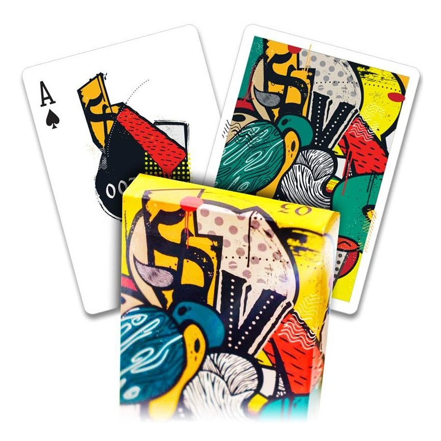 OFF THE WALL présente une conception de dos de peinture graffiti personnalisée, un Ace of Spades personnalisé, des cartes REVEAL Court dans tout le pont et des cartes personnalisées avec une touche subtile de sensation vintage.