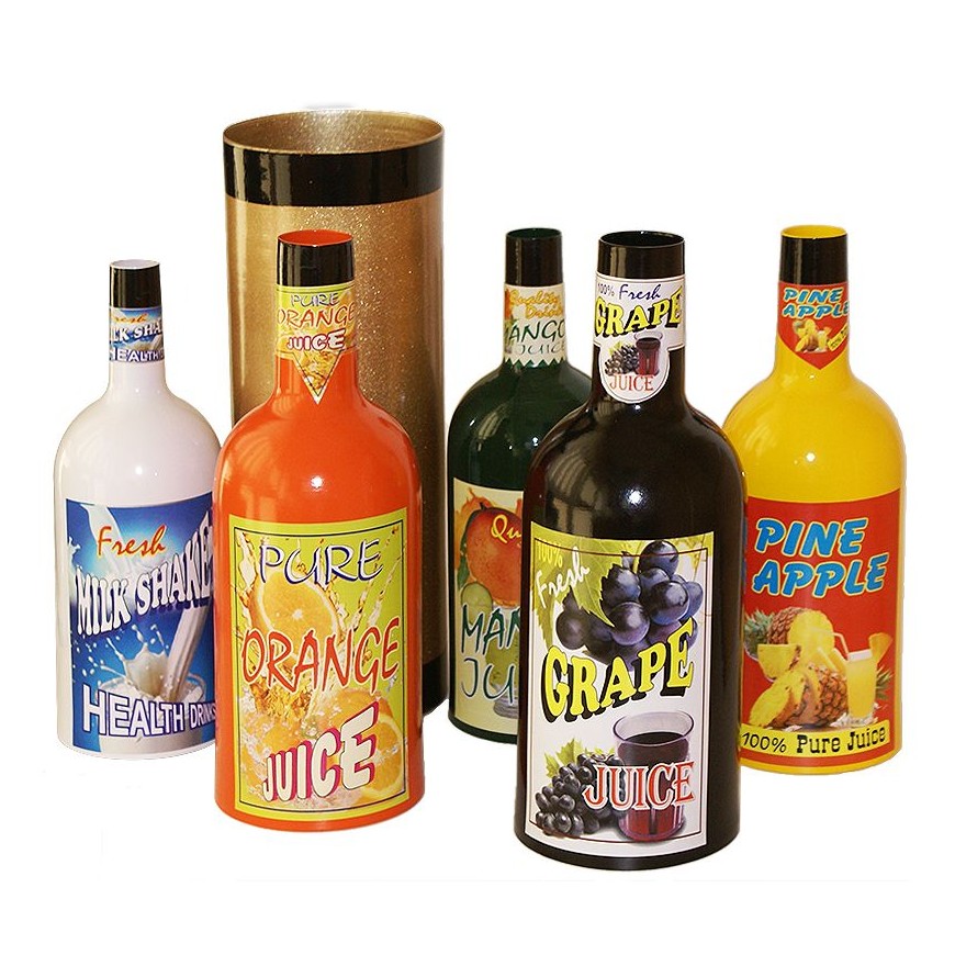 • Les bouteilles ont des couleurs différentes pour une production agréable et vivante, et chacune a une étiquette d'une boisson différente dessus.