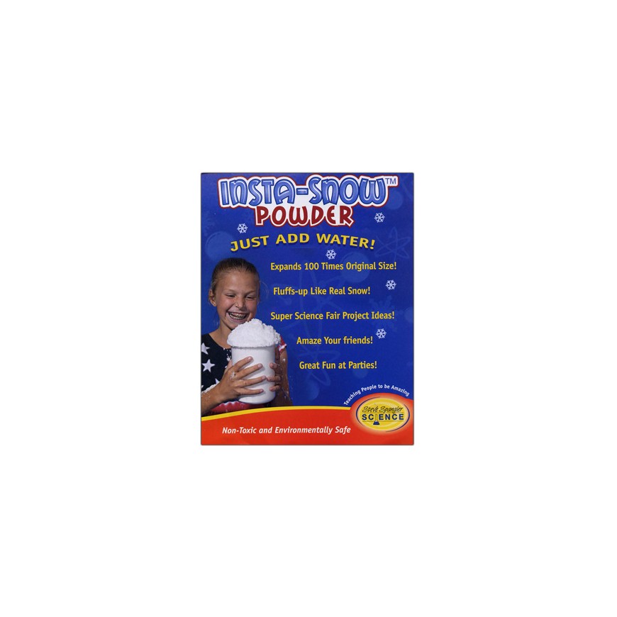 Il suffit d'ajouter de l'eau Insta-Snow est une poudre superabsorbante incroyable qui ressemble à de la vraie neige lorsque vous ajoutez simplement une petite quantité d'eau! Cette poudre spéciale se dilate jusqu'à 100 fois son volume d'origine pour créer la fausse neige la plus incroyable que vous ayez jamais vue. Idéal pour les fêtes, les décorations, les projets d'expo-sciences, la photographie ou comme démonstration magique pour épater vos amis! Insta-Snow Powder est disponible en trois tailles différentes: Bocal (100 grammes) avec guide d'activités (assez de poudre pour 2 gallons de neige!) Sac (40 grammes) avec guide d'activités Tube (environ 10 grammes) avec guide d'activités