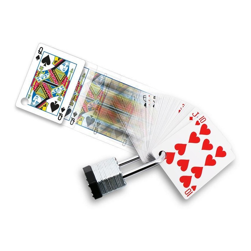• Fabriqué avec des cartes Bicycle originales, taille poker. Le gros cadenas est fourni.