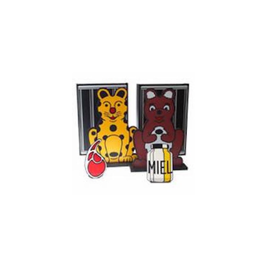 Comme ils sont mignons ESTHER et FRIPON ! Deux figurines représentant une panthère «Mademoiselle ESTHER» et un petit ourson «Monsieur FRIPON». Bien qu’étant mignons, ils n’en restent pas moins des animaux sauvages et des animaux sauvages ne mangent jamais devant les enfants, ni même devant les grandes personnes d’ailleurs. Expliquez à votre jeune public que tous les soirs le gardien du zoo enferme donc ESTHER et FRIPON dans leurs cages respectives et met devant chaque cage le plat préféré de ses 2 pensionnaires. Montrez alors