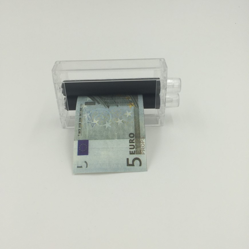 Un effet magique qui fait des rêves une réalité! Prenez un morceau de papier, placez-le entre les deux rouleaux de votre «imprimante à billets» portable, tournez la petite roue pour activer les rouleaux et… le morceau de papier blanc se transformera visiblement petit à petit en un vrai billet de banque! Étonnez votre public!