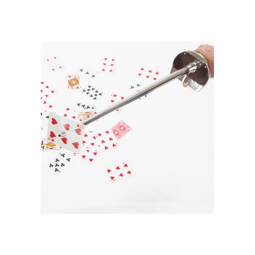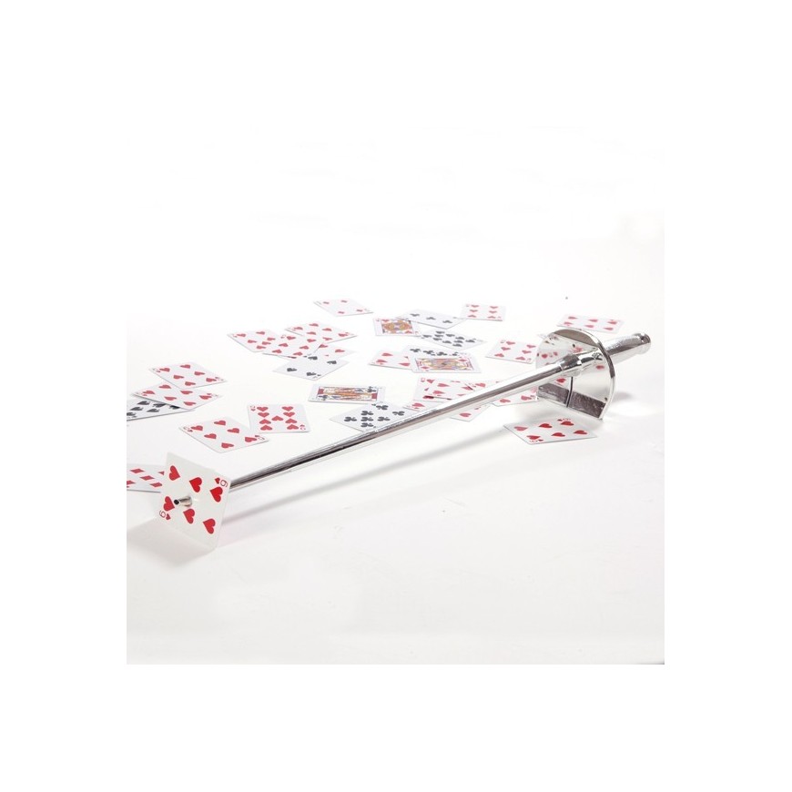 Cette épée vous permettra de retrouver la carte choisie par le spectateur avec un effet très visuel. Le magicien demande à un spectateur de choisir une carte, mélange le jeu de cartes puis demande à différents spectateurs de faire de même. Pendant ce temps, le magicien présente son épée et joue avec.